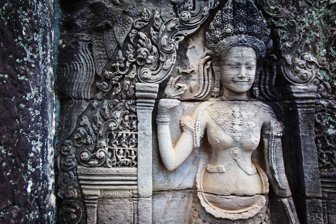 Detailed carvings of nearly 2,000 sensual celestial maidens, known as apsaras, line the walls in alluring poses, from the pavilion to the tops of the high towers. They wear ornate jewelry and exquisite headgear with only a strip of cloth bound round the waist, showing bare breasts of milky whiteness.
